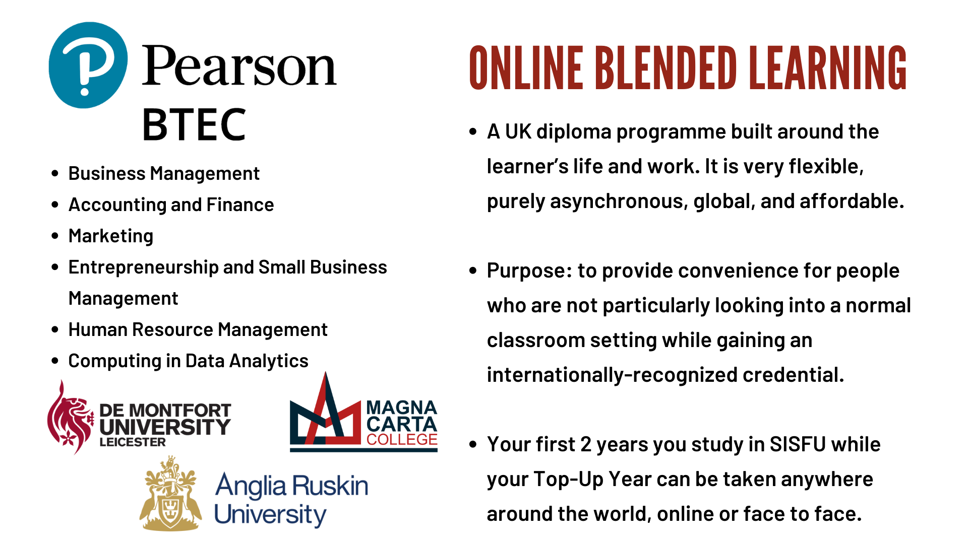 SISFU Online Blended Learning (OBL) offers you a broad choice of business courses in Management, Finance, Human Resource, Marketing, and Entrepreneurship. You will experience work-based learning, supported with committed mentoring and assistance to help you progress and succeed in your study and soon, to be an effective manager and leader.