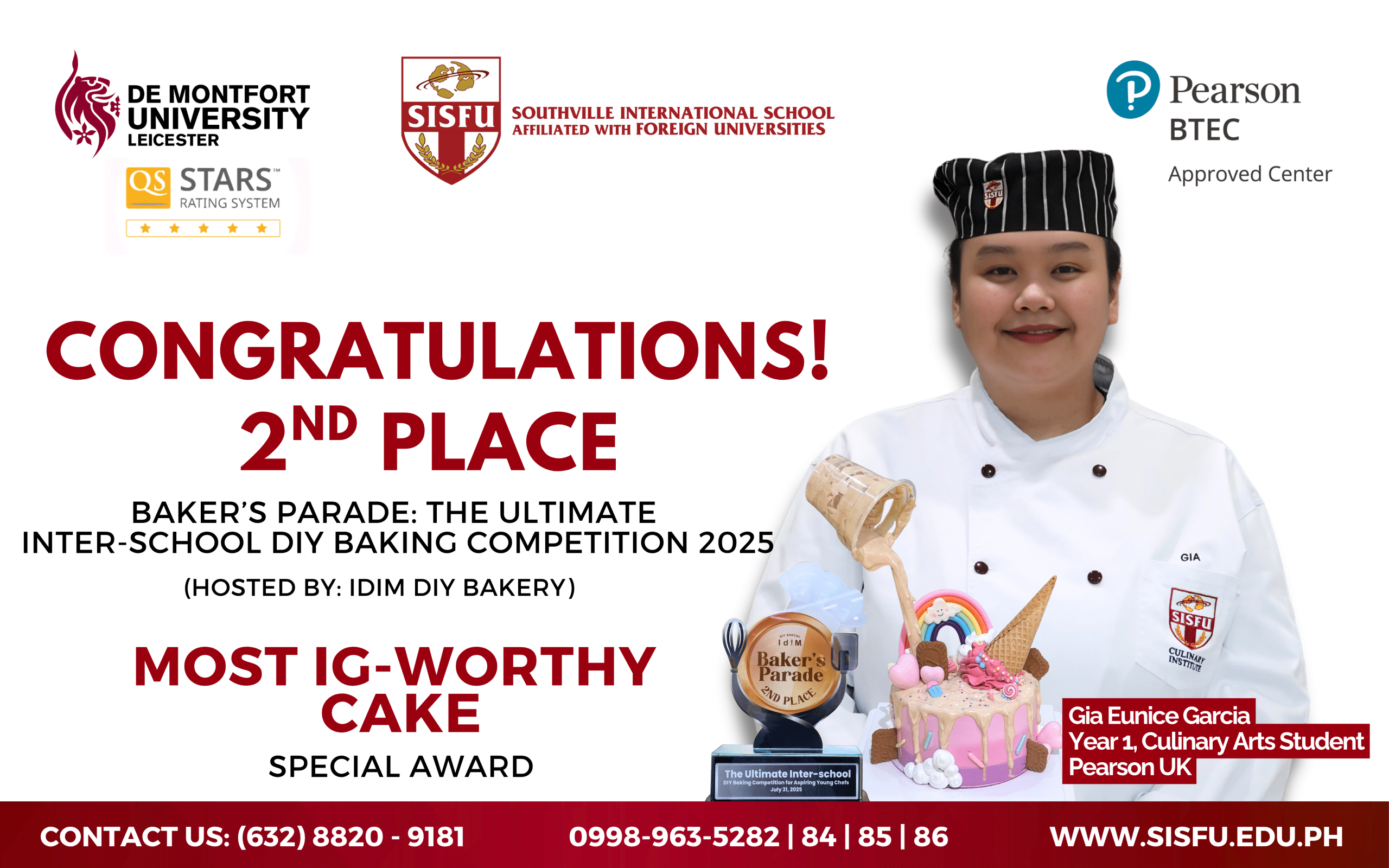 Among 22 participating schools, Gia stood out for her creativity and skill, bringing home 2nd Place (Bronze Award) and a Special Award for the Most IG-Worthy Cake.
